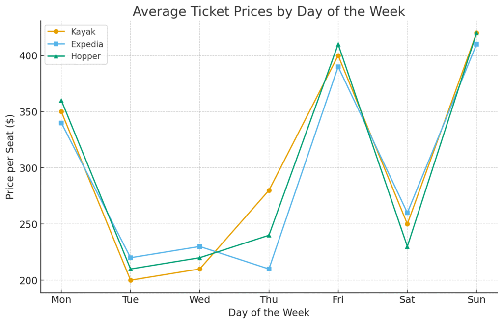 You may ask yourself “Why do these patterns exist?” It really comes down to the demand of the two groups: business travelers and leisure travelers. Business travelers often fly Monday through Thursday and cause a dip in the price due to less travelers. Again less demand, lower prices. Leisure travelers, on the other hand, prefer to leave on Fridays and return Sundays, which pushes up demand and prices for those days. More demand, higher prices. That leaves Tuesdays, Wednesdays, and some Saturdays with lower demand, making them the sweet spot for budget-conscious travelers.
